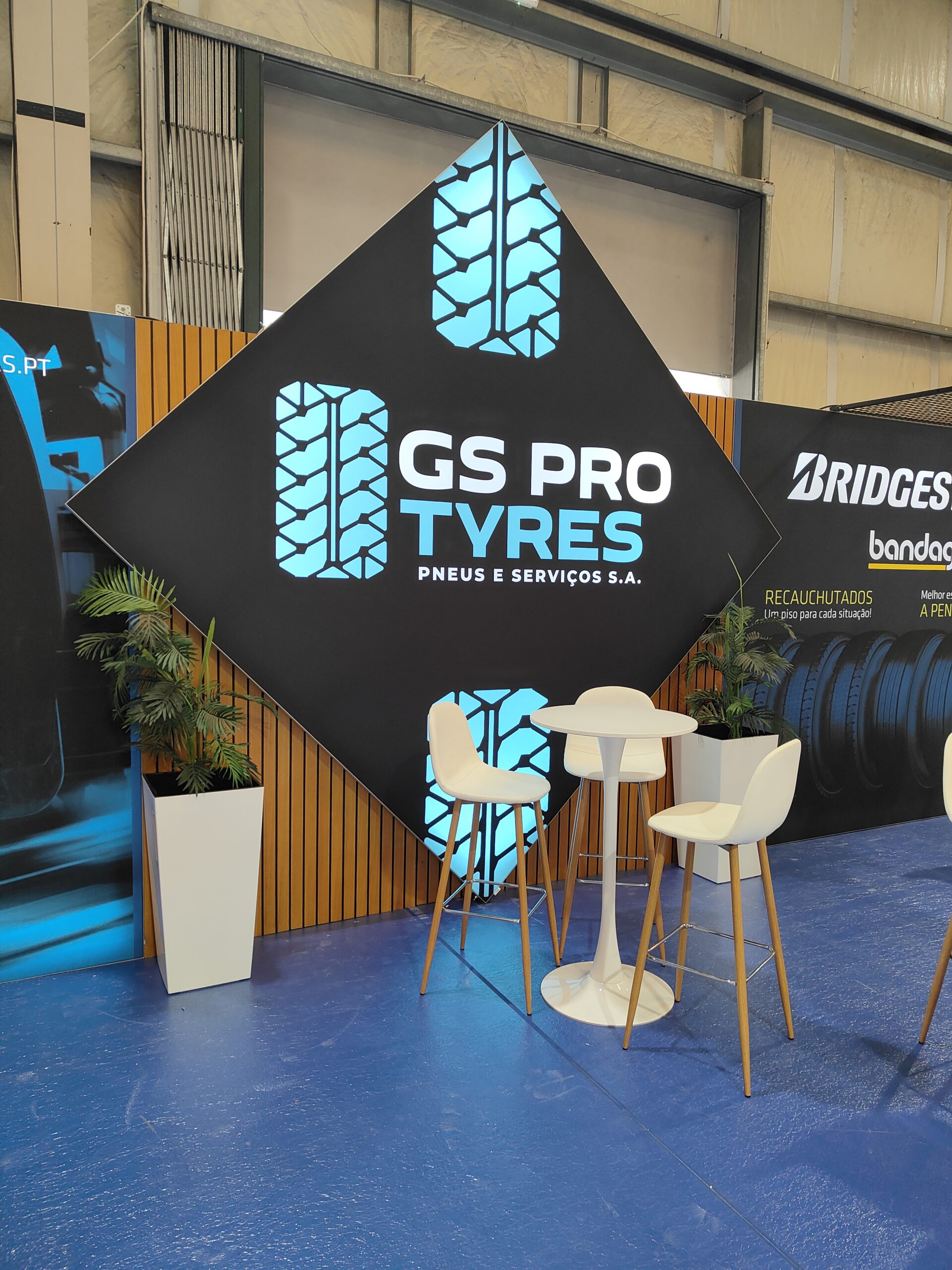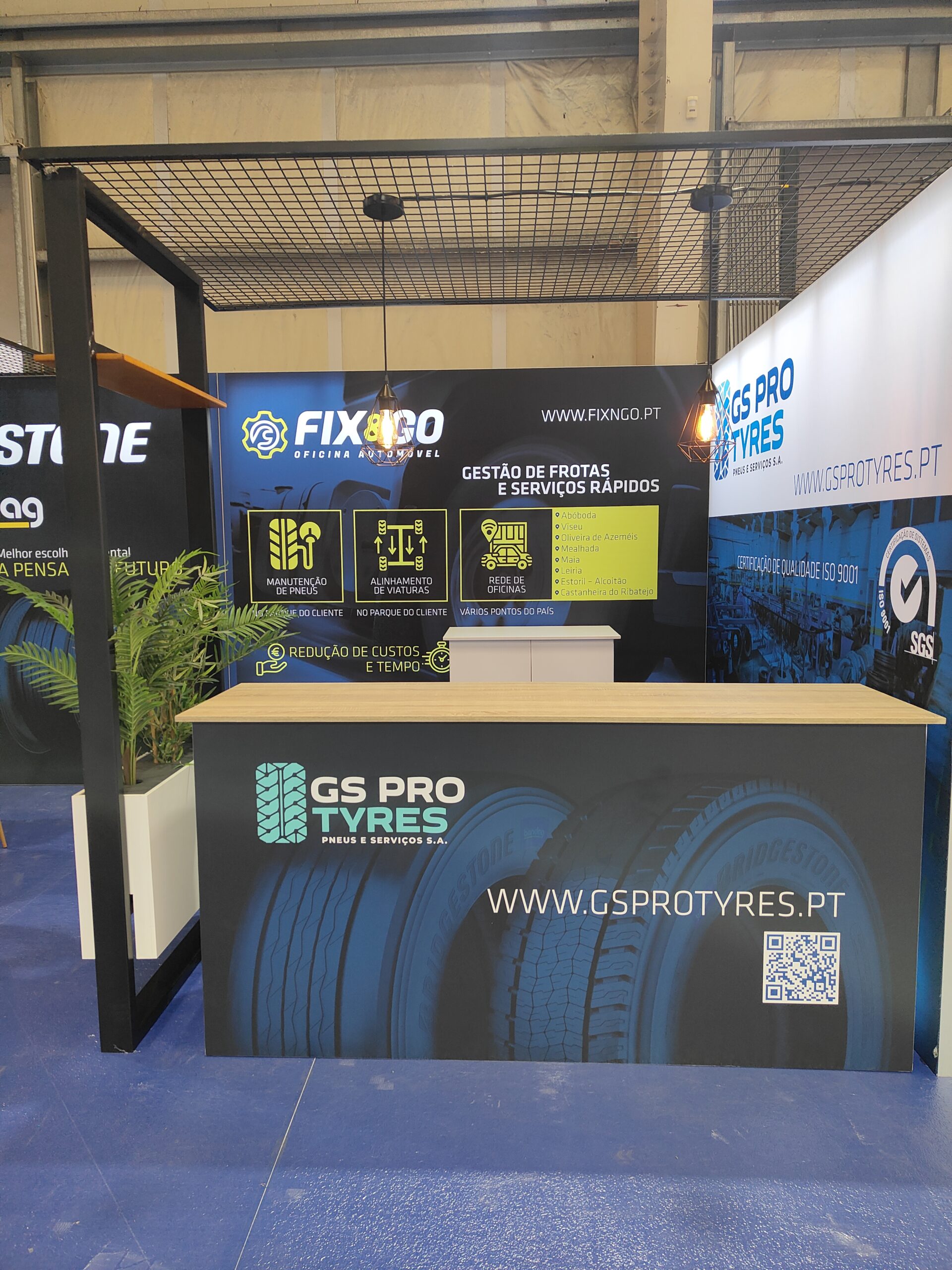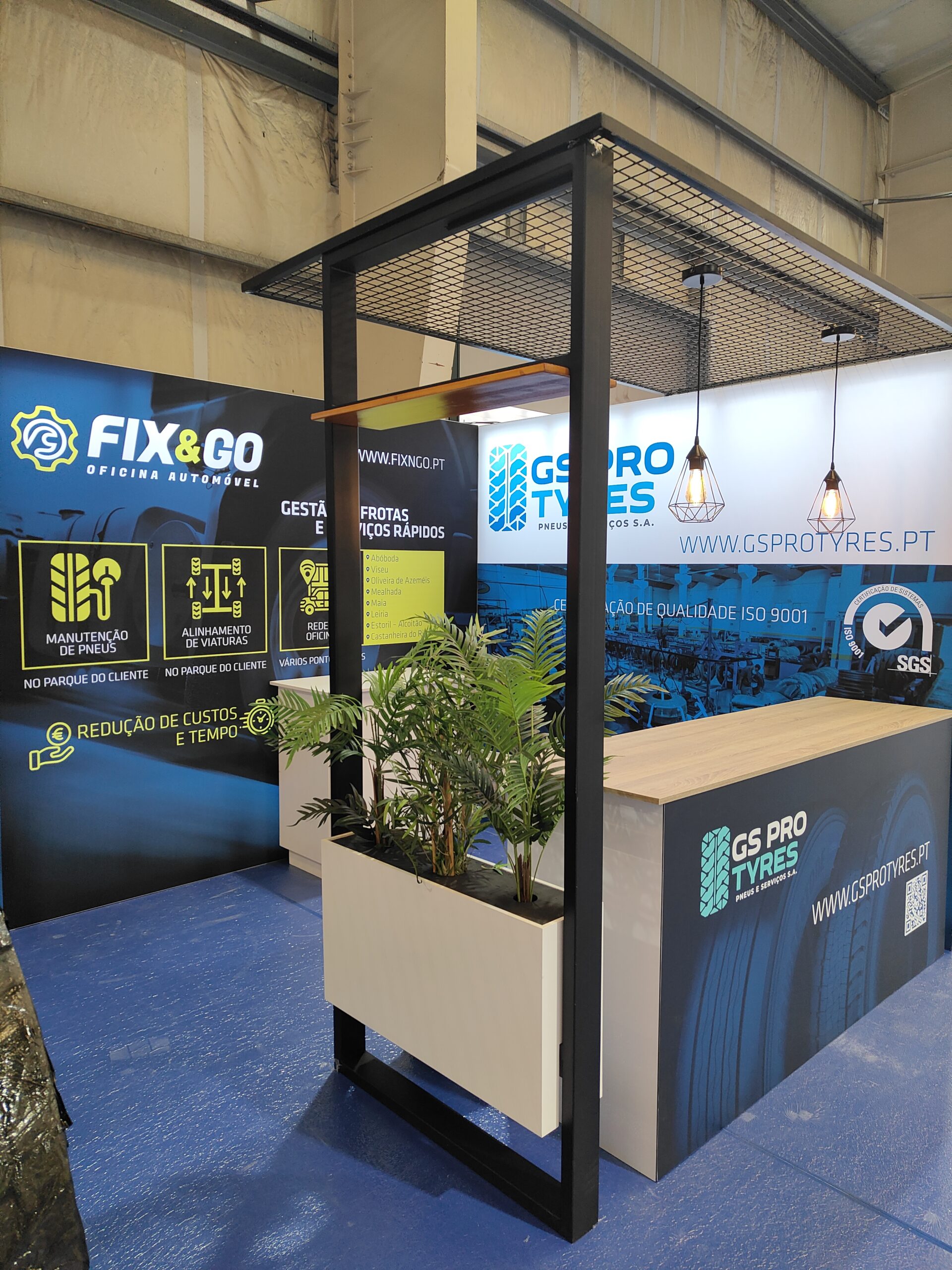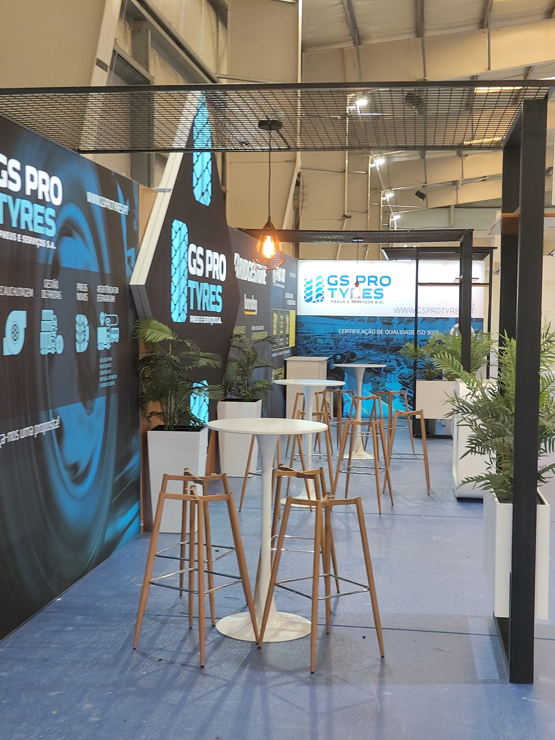 Stand em perfil EuroFrame e têxtil impresso, com estruturas de madeira ripada de apoio aos tetos em rede, iluminação direta e indireta, a parte de comunicação em têxtil impresso, com diversas zonas de recepção aos clientes.