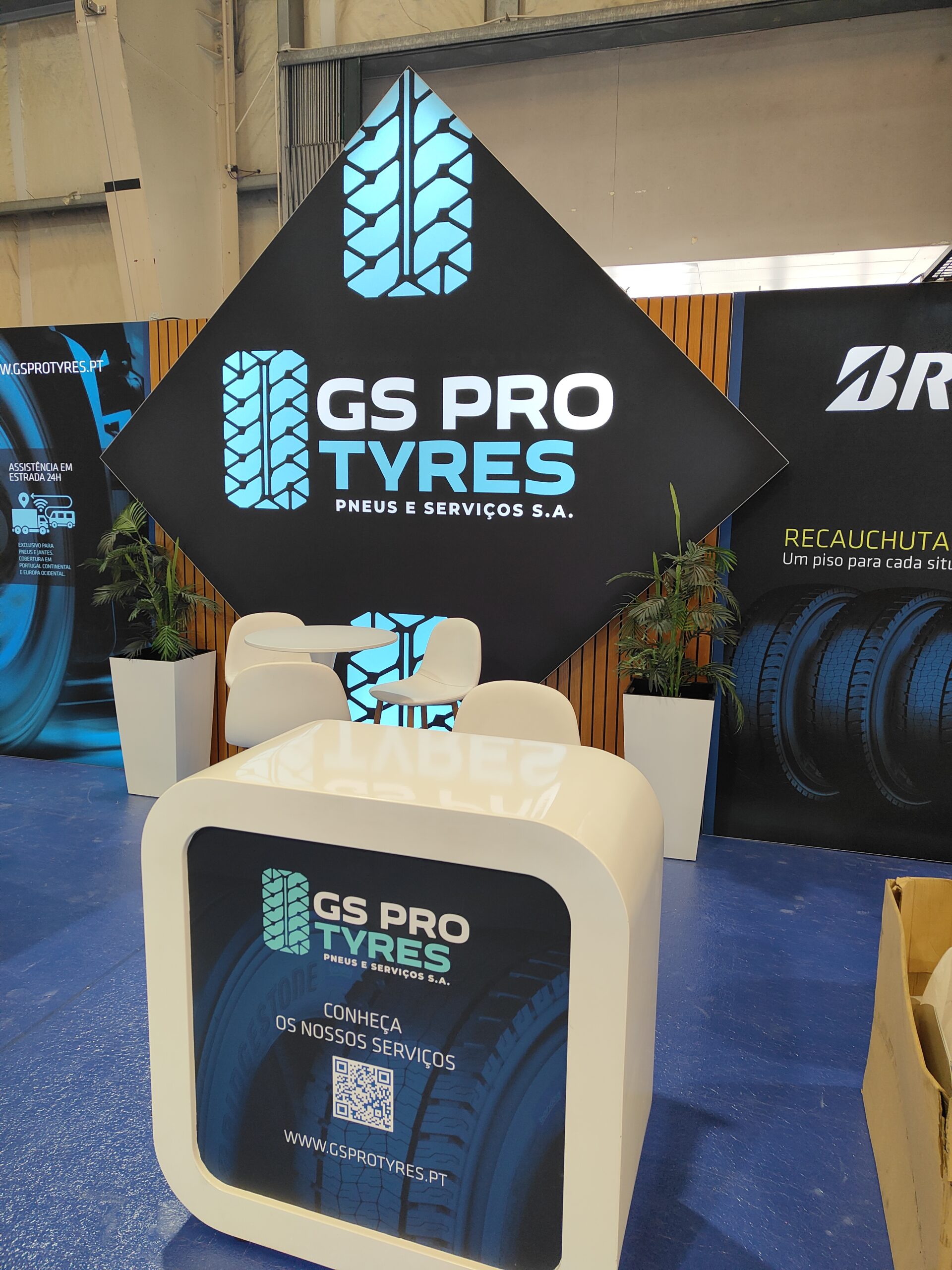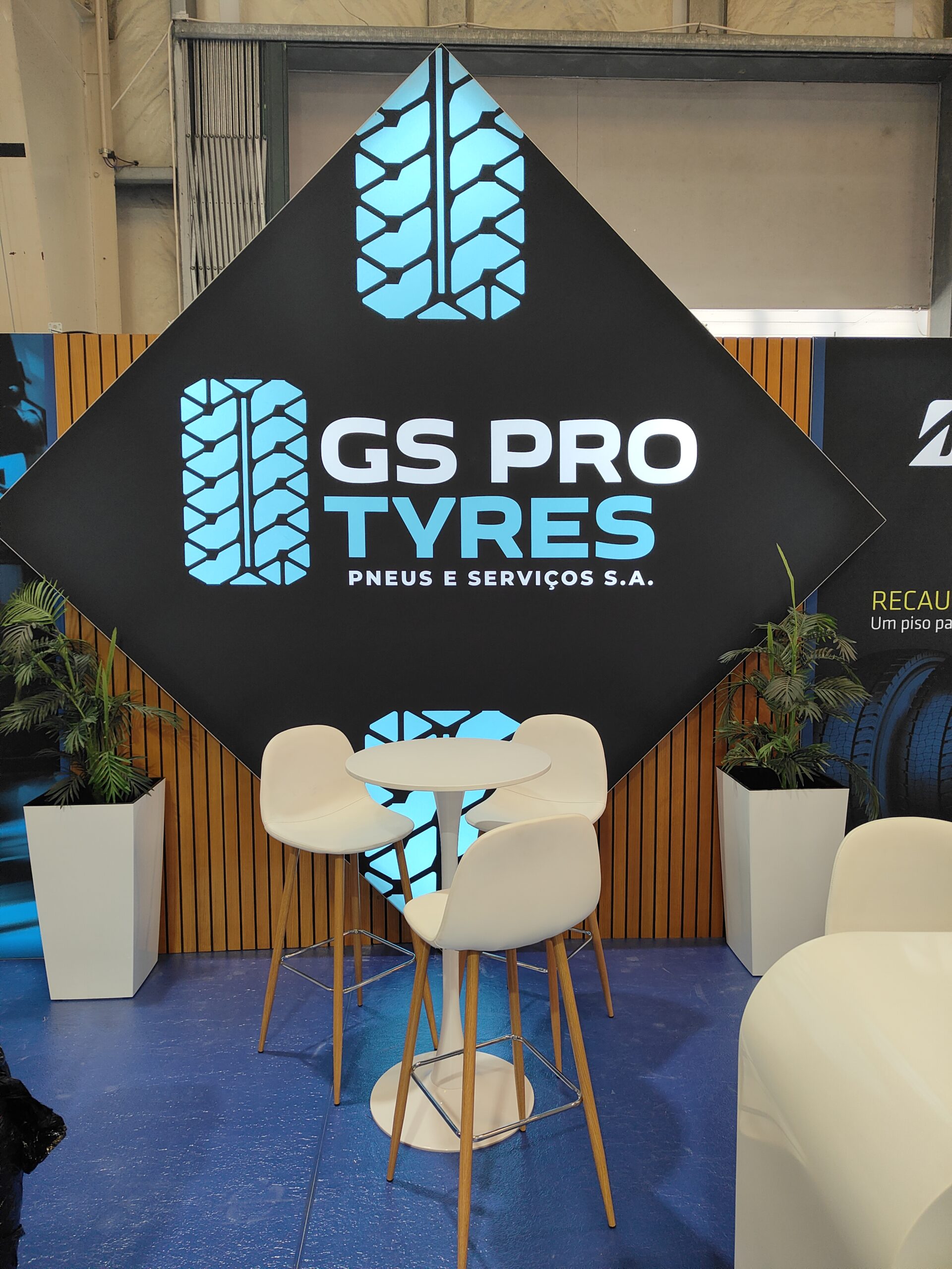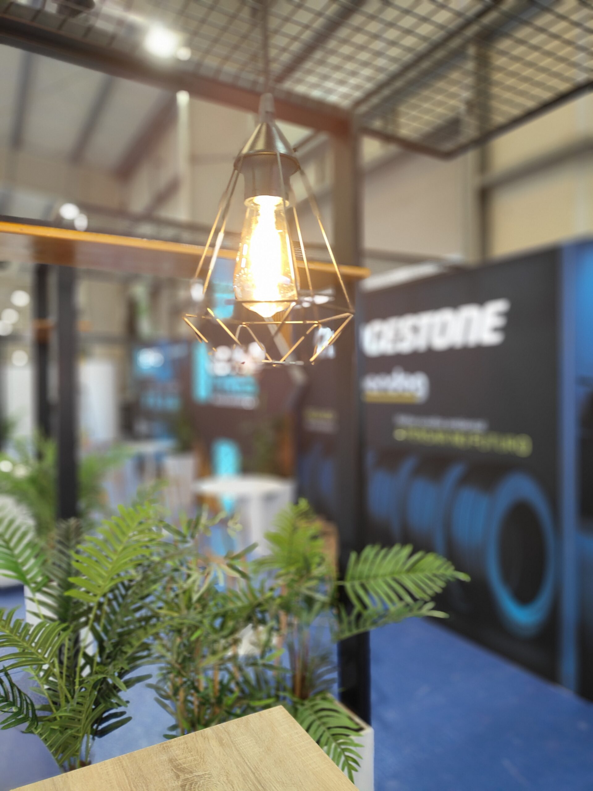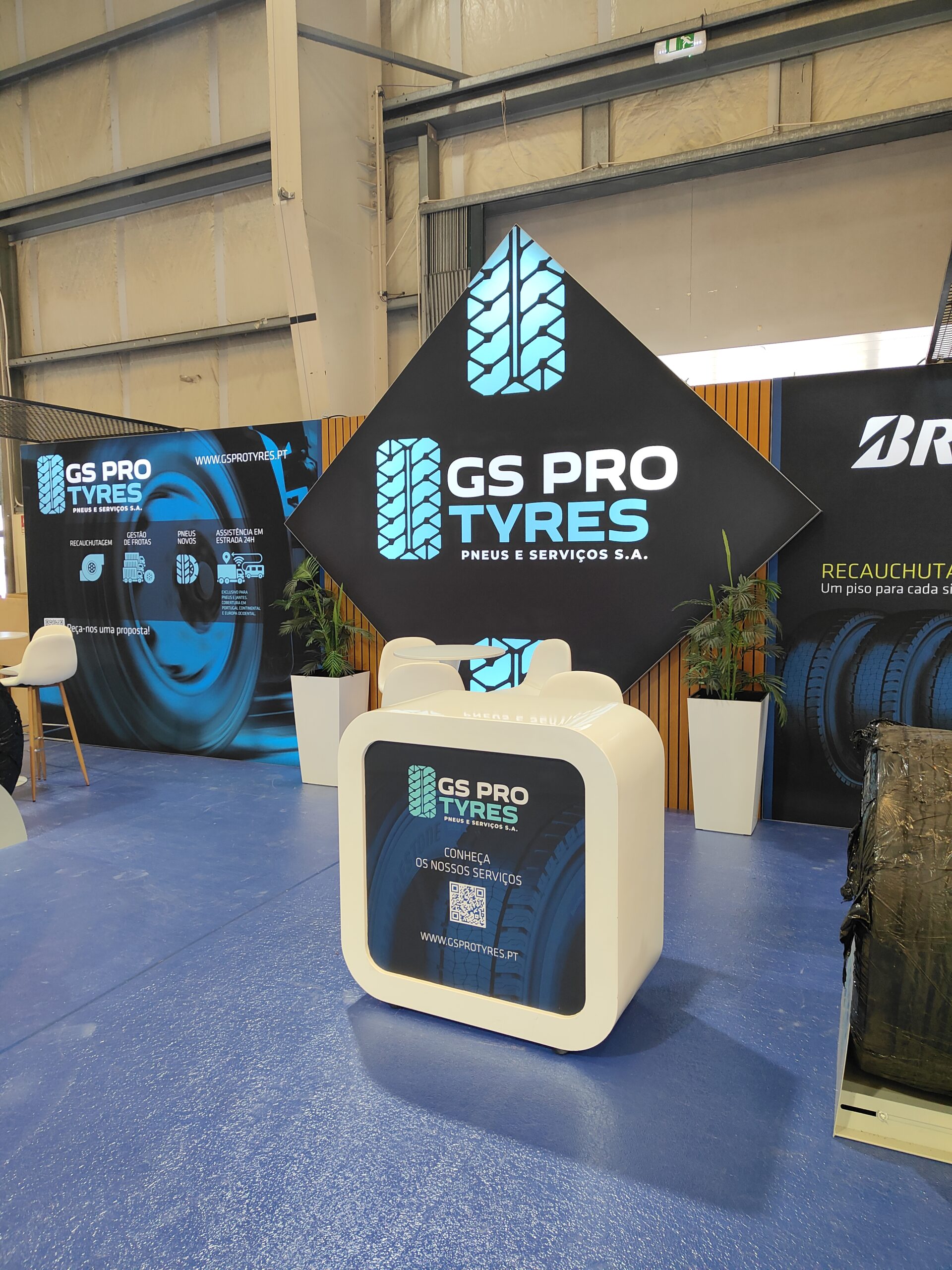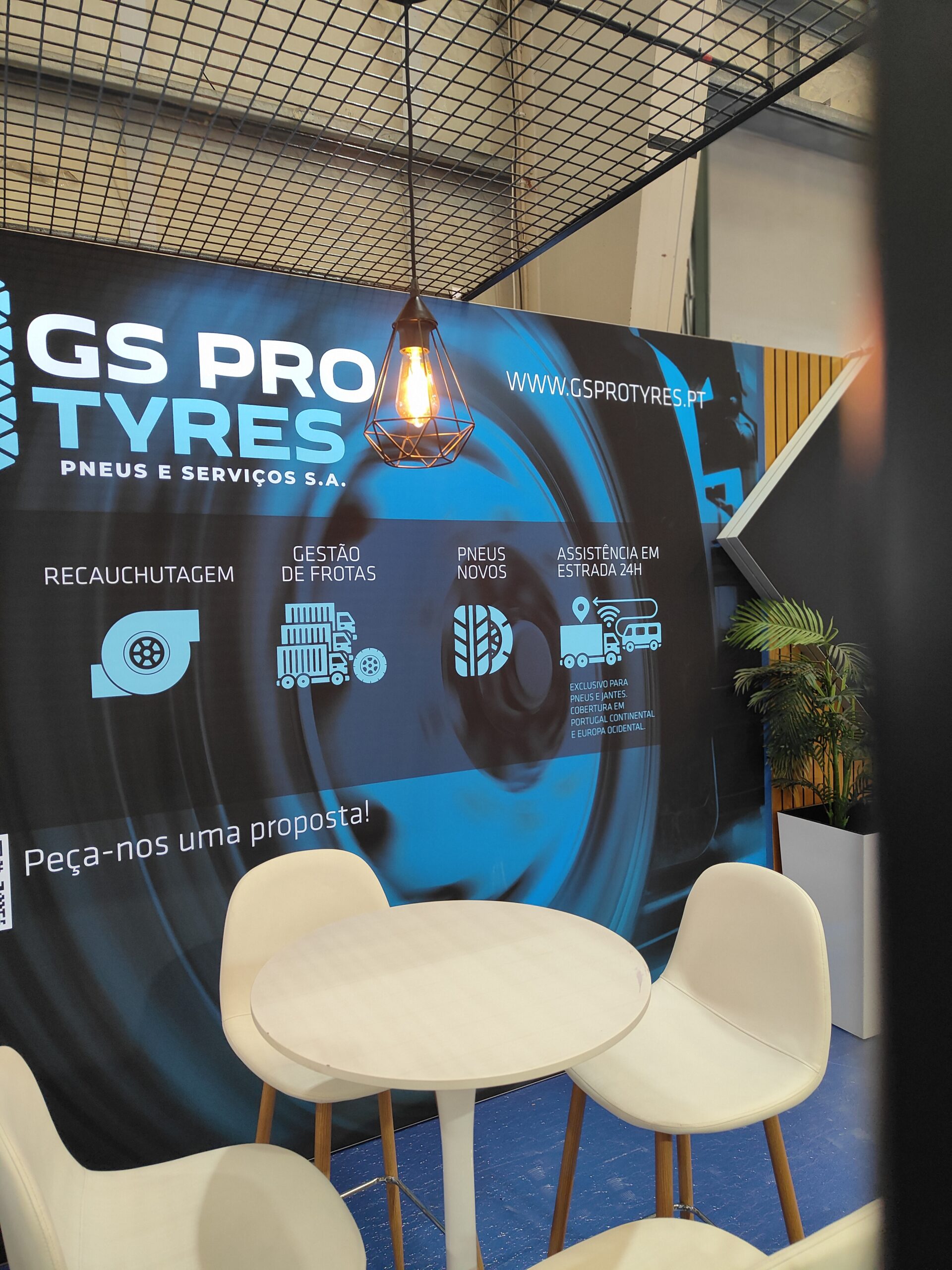 Stand em perfil EuroFrame e têxtil impresso, com estruturas de madeira ripada de apoio aos tetos em rede, iluminação direta e indireta, a parte de comunicação em têxtil impresso, com diversas zonas de recepção aos clientes.